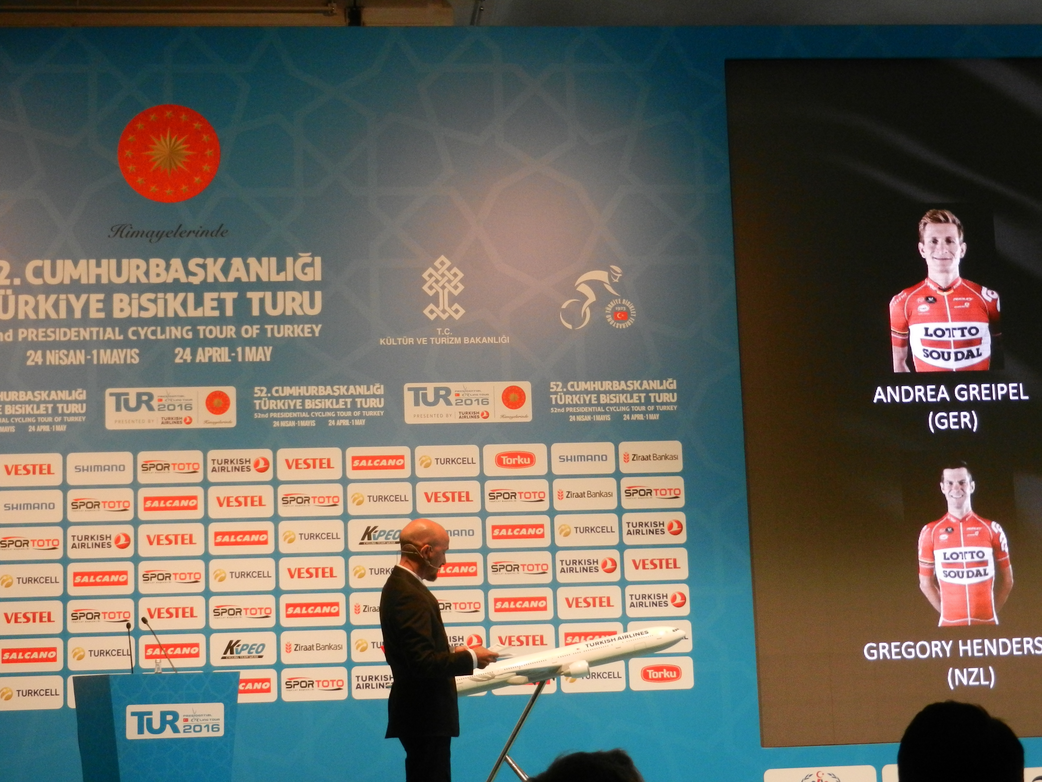 Özçelik üstlendi.Açılış konuşmasını ise Bisiklet Federasyonu Başkanı Emin Müftüoğlu yaparken, toplantıya Cumhurbaşkanı Recep Tayyip Erdoğan adına Genel Sekreter Fahri Kasırga, Gençlik ve Spor Bakanı Akif Çağatay Kılıç adına Müsteşar Faruk Özçelik, Gençlik ve Spor Genel Müdürü Mehmet Baykan, sponsorlardan Vestel adına Pazarlama Müdürü Ergün Güler, Salcano adına Genel Müdür Bayram Akgül, yeni direktör Roland Hofer ile birlikte Takımlar Direktörü Gürol Çaydaş ve spor basınından davetli isimler katıldı.